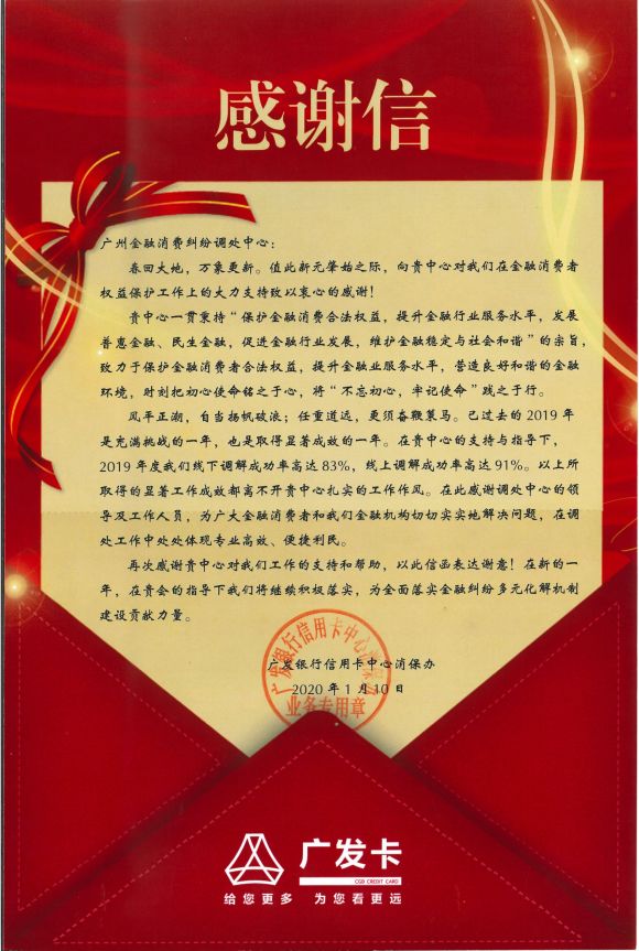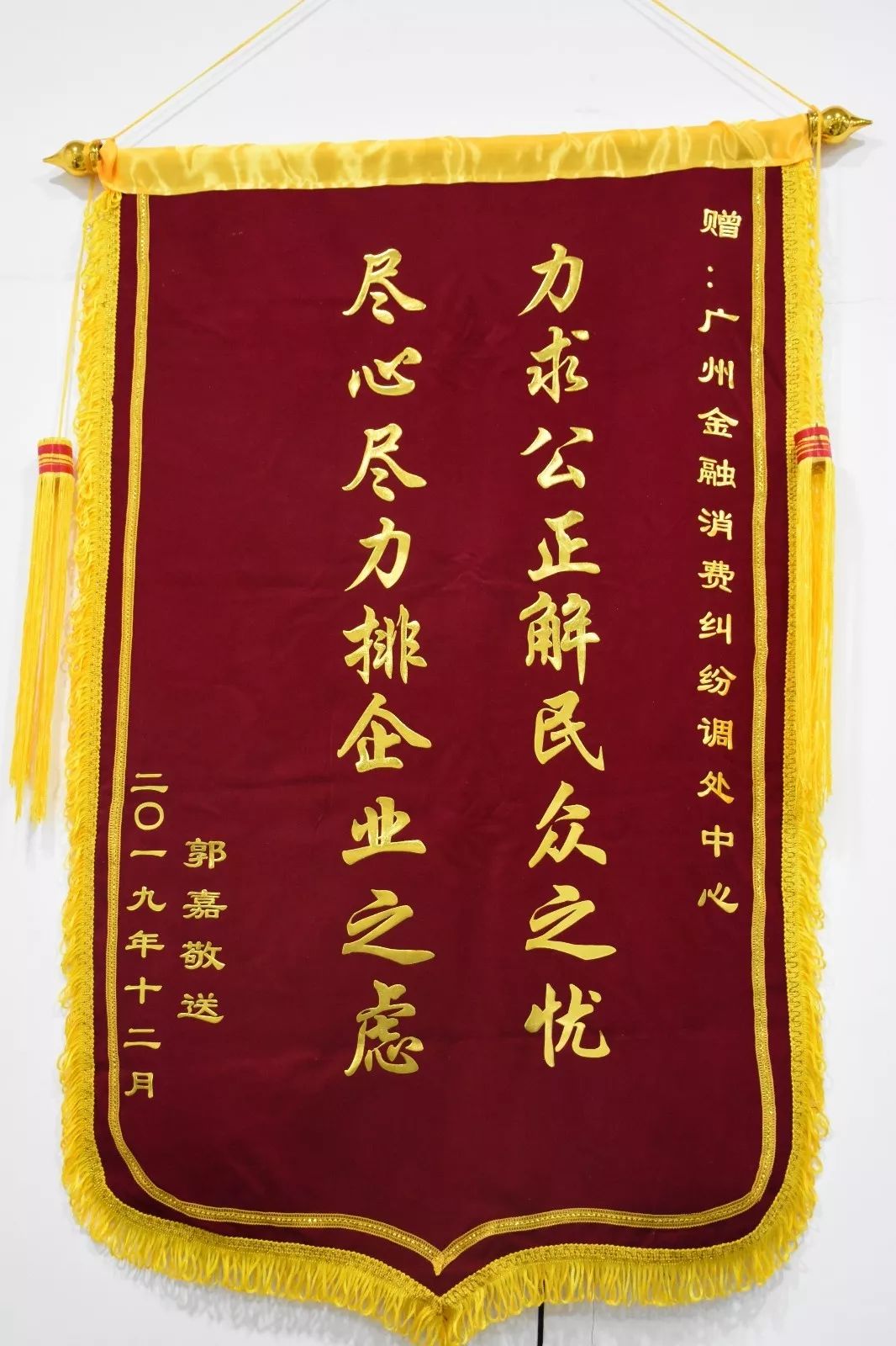 近日,广东省金融消费权益保护联合会广州金融消费纠纷调处中心(广州市金融消费纠纷人民调解委员会,以下简称“调处中心”)收到来自广发银行信用卡中心的一面印有“排忧解难促发展 定纷止争创和谐”的锦旗以及一封感谢信,对调处中心成功化解多起协商还款纠纷表示感谢。还有来自郭某代表某消费金融公司邮寄送来一面印有“力求公正解民众之忧,尽心尽力排企业之虑”的锦旗,对调处中心成功化解该公司与消费者的贷款纠纷表示赞扬。