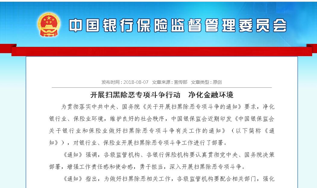 8月7日,银保监会对外发布《中国银保监会关于银行业和保险业做好扫黑除恶专项斗争有关工作的通知》(以下简称《通知》),对银行业、保险业开展扫黑除恶专项斗争工作进行了部署。